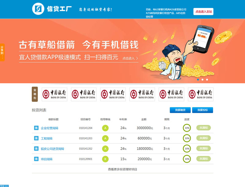 信貸工廠是中國最大的貸款搜索和服務(wù)平臺,截止2013年底,在貸款意向和成交量、成交率方面已經(jīng)位居業(yè)內(nèi)第一,是中國信貸搜索第一品牌。信貸工廠貸人尋找到最佳的貸款渠道,也能幫銀行及金融機構(gòu)尋找精準匹配的信貸客戶!信貸工廠本身不提供貸款,而是重點著眼于幫助個人、中小企業(yè)篩選金融市場上的正規(guī)合法貸款渠道,幫助其最終實現(xiàn)貸款,實現(xiàn)網(wǎng)站"找正規(guī)貸款,就上信貸工廠"的定位初衷!信貸工廠是中國最大的貸款搜索和服務(wù)平臺,截止2013年底,在貸款意向和成交量、成交率方面已經(jīng)位居業(yè)內(nèi)第一,是中國信貸搜索第一品牌。信貸工廠可以為借貸人尋找到最佳的貸款渠道,也能幫銀行及金融機構(gòu)尋信貸工廠配的信貸客戶!信貸工廠本身不提供貸款,而是重點著眼于幫助個人、中小企業(yè)篩選金融市場上的正規(guī)合法貸款渠道,幫助其最終實現(xiàn)貸款,實現(xiàn)網(wǎng)站"找正規(guī)貸款,就上信貸工廠"的定位初衷!信貸工廠