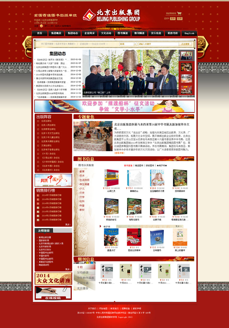 北京出版集團是北京市最大的綜合性出版機構(gòu),有著悠久的歷史和深厚的積淀,前身為1948年成立的北平大眾書店。新中國成立后,改為北京大眾出版社,1956年正式更名為北京出版社。1999年成立北京出版社出版集團,是國家新聞出版總署首批七家試點出版集團之一。2009年正式轉(zhuǎn)企改制,成立北京出版集團有限責(zé)任公司。如今,集團下屬8家專業(yè)出版社、5家雜志社和14家子公司,共有員工750余人。