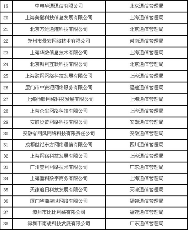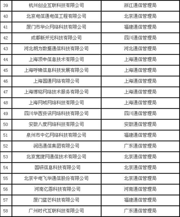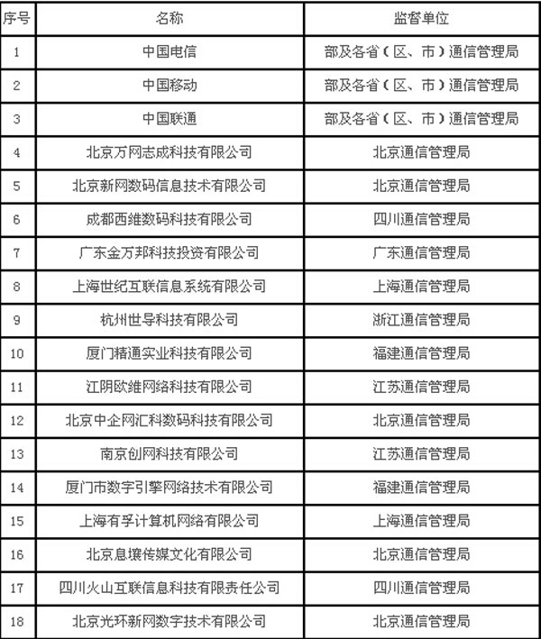 工信部重點接入服務商名單