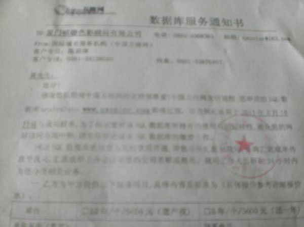 黃總稱當(dāng)時不相信,拿著《網(wǎng)站服務(wù)通知書》咨詢做網(wǎng)絡(luò)的朋友,其朋友回答說:“有可能是騙子,也有可能是真實,但一定要跟原服務(wù)商取得聯(lián)系才能辨別出真假�!庇谑牵S總將《網(wǎng)站服務(wù)通知書》通過QQ郵箱傳給原服務(wù)商,但原服務(wù)商一直沒有回音,心理也一直擔(dān)心網(wǎng)站被關(guān)閉而造成數(shù)據(jù)丟失,而且空間確實對快到期了,2011年3月3日,就直接按對方提供的帳號續(xù)費了4800元人民幣。