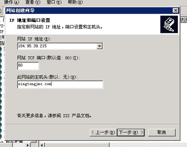 七:在網(wǎng)站IP里面填你的網(wǎng)站ip,網(wǎng)站主機頭寫不要www的域名。然后下一步